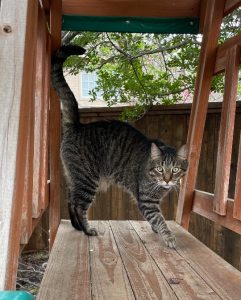 Fred is a large gray and black cat. He has a black stripe down his back. Very friendly.