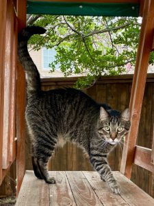 Large grey and black stripped with some brown mixed in. Very friendly.