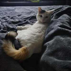 One blue eye, one amber. Heart shaped black spot on head. Pink nose, ears and paws. Calico tail. Extra toes. Is an emotional support animal for disabled woman.