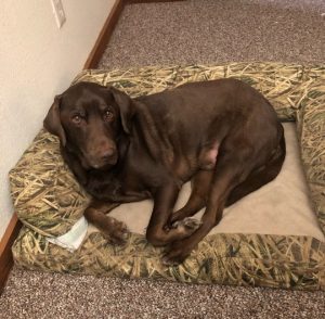 Chocolate lab, friendly, had lumps, grey chin, deaf