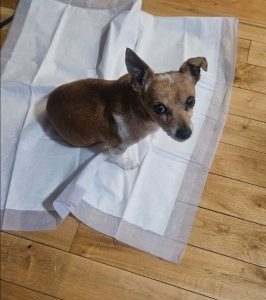 Tan, white spot on head. White belly and paws. Cataracts, cough, bent left ear. Microchip