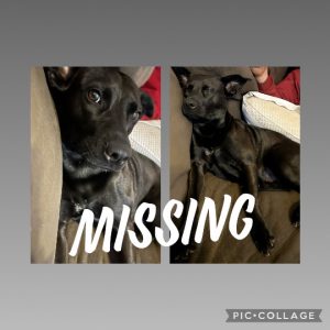 Solid black with one small white spot on her chest she has big ears and a long tail very hyperactive and sweet