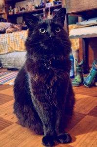 He is long haired black male neutered with little white on his chest he has a missing piece of his tongue in the front last seen wearing a orange collar with a bell on it
