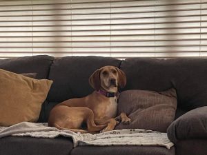 She is about 60 lbs, very lean, with a cranberry colored nose, and has a distinctive scar on her lower half of one side from a surgery. She is chipped and had her collar on with all of our information.