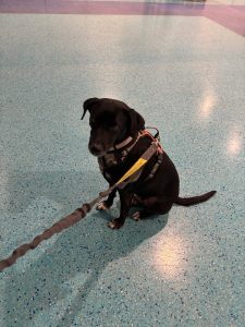 Approx 20lbs black with white chest and white tips of paws. Wearing pink collar and camo vest. Has a torn ear.