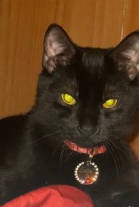 He is all black with green eyes if he still wearing his collar it’s a red bandanna collar with his name tag it say “Sage” with diamonds on the front with a red paw print