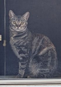 Small cat, has a copper colored spot on her head. Striped with marbling on her hind quarters. Has allergies and sneezes a lot.