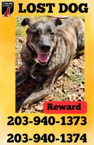 Knox is a 85 lb Brindle Mix. He has a brown leather collar with a tag with his name on it. End of his long tail has a notable curl to it.