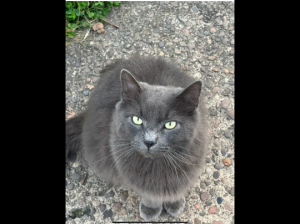 He is a pretty big fully grey cat with longhair, his pupils get big often, he is friendly, in the sunlight he has bright green eyes, hair growing from his paws, no collar, dark grey nose, distinct mouth, his cheeks and nose bridge around his nose is a slightly lighter grey than the rest of him(shown in photo). Has that slightly lighter grey under his eyes a faint line beneath. White whiskers. He loves and misses his mom!