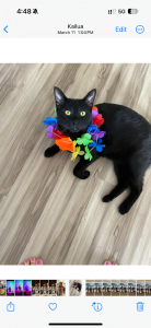 Almost all black. Large (likes to eat) and very social cat. Has a chip and has been neutered. No notched ear.