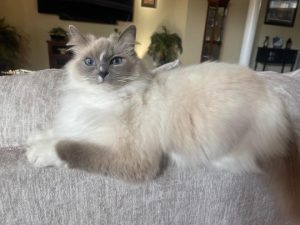 Fluffy white mitted Ragdoll cat with light gray markings on face, ears, and legs. Stunning blue eyes that could melt any heart.