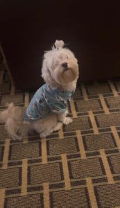Maltese/Morkie Wearing Blue and White Pajamas(Different from the photo) has a small hair tie on his head.