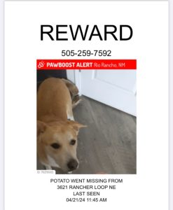 Tan with white face and white underbelly, black spot left side neck, 1 floppy ear and 1 pointy ear.