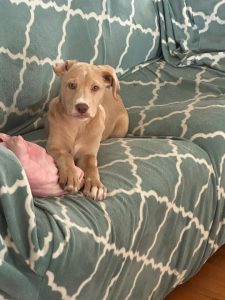 Daisy is a pit mix. Her fur is blonde and white. She has white on her paws, chest, and nose. She is friendly if you come in contact with her.