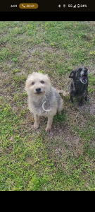 Grey and white border terrier service animal, microchip