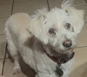 She is sweet and friendly buy deaf since she is an old dog. She has a red collar and heart-shaped pendant