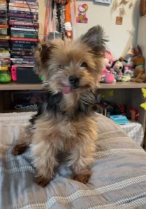 Yorkie, tongue hangs out due to missing teeth! Chipped and was fixed has small tattoo on stomach.