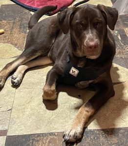 Brown with tan paws and accents. About 8 months old. Last seen wearing a black harness. Very sick with valley fever and NEEDS his medication. Bone growth on left side of jaw.