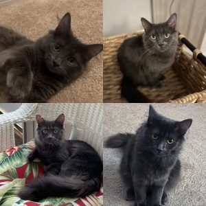 She is 1 year old she has long gray hair green eyes and is small, fluffy long tail very shy and likes to hide