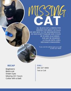 She’s all black, green eyes, has little white hairs back of her neck, she has a tummy she’s not skinny, average size, but her face is tiny compared to the rest of her. She should be wearing a pink collar with a bell. She’s not chipped but you catch her she has a chipped tooth of the left side of her mouth.