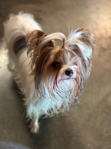 White in color with black spot on lower back. Black and brown ears and cropped tail. Last seen with a turquoise flower shaped bow.