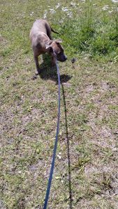 Breed: Staffy, bully mix Color: Brindle white patch on chest