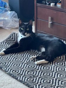 Black and white tuxedo cat that is mostly black with a white belly and paws and a white spot on nose/mouth area.