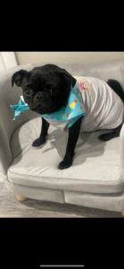 She a female black Pug:Chihuahua mix. She’s wearing a harness with the leash still attached.