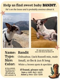 Breed: Chihuahua / Jack Russell mix Color: White with brown spots and speckles