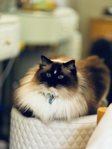Pepper is a seal point Ragdoll cat with a white blaze on his head, he is about 16 pounds and was wearing a blue collar with fish tag.