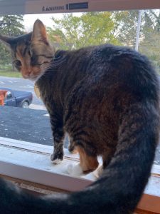 One eye tan with black stripes like a mainecoon, with a white underbelly and white paws and blonde throughout her coat. She’s abt 10/11 ibs.
