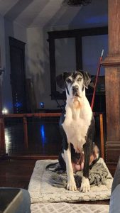 115 to 120 lbs black and white dane. Scars on her left and right side by her shoulders from when she got attacked as a puppy
