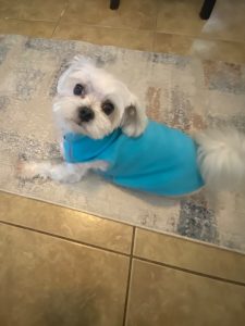 White dog, maltese, 8 pounds, 4 yrs old, energetic, dark brown round eyes, black nose, black and red collar with his name fandoc and phone number 3109337453, straight to wavy hair