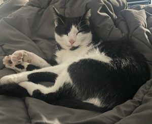 Male, domestic, short-hair. Black and white fur, with black patch on chin. Neutered and chipped. Friendly, but skittish around new people. He’ll likely run away if approached.