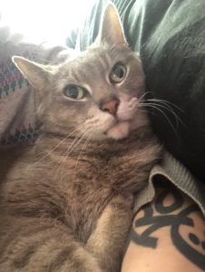 His name is Waterhorse but he answers to “Baby” he is a grey tabby with an orange nose no collar