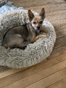 14 lb. recently groomed so fur is short. He looks like fox with black streak down his back with big ears