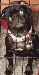 2 1/2 year old black Pug She can be shy so please don't chase. She is wearing a pink & white collar with a dented golden bell & a stainless steel black and silver bone shape name plate