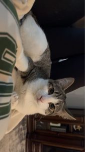 Tabby colors on top and tail, white stomach and legs/feet, green/brown eyes, yellow spot right by nose, long tail