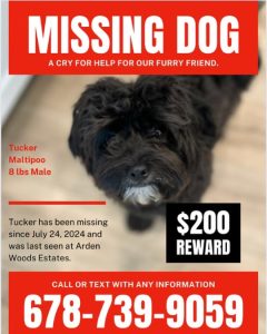 Black maltisepoodle. About 10 pounds blue checked collar. Little white patch under his mouth.