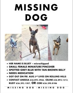 Bluey is a Miniature Pinscher. She is Blue/Grey spotted w a Tan belly. She is VERY small . She does need medication daily.
