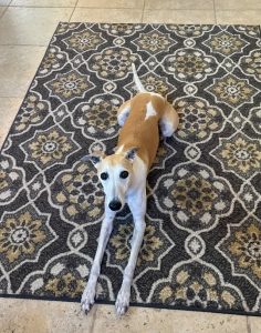 Sweet and skittish 9 year old Whippet with tan and white coat