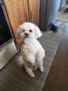 Shiloh is a 2 year old teddy bear dog (bichon/shih tzu mix). He is white with cream ears. He was recently groomed and had his coat shaved short except for his tail and ears. He is wearing a thin blue collar. He is microchipped. He can be quite shy with strangers. He responds extremely well to treats and cooked food like bacon or hamburger or chicken, and to sweet talk (likes to be called "baby" and "sweetie" and "honey") and gentleness.