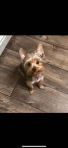 Breed: Yorkie Color: Dark gray and tan