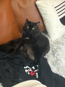 Octane is a large fixed adult male (11-12lbs). Medium-hair, all black with small white tuff on his chest, soft brownish grey underbelly and long bushy tail. Slight split/clipped left ear.