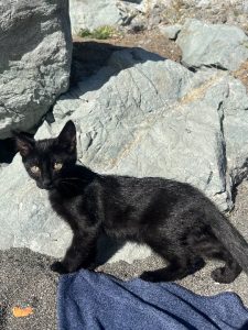 Tom has a very long tail and is very lengthy, he is friendly and responds to his name or treats. He has small white strands on his two front legs and weighs around 6 pounds.