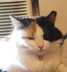 Medium length hair black patch over left eye with clipped ear and golden brown patch over right eye. She is wearing a purple and green flower shaped collar with a bell on it. She is fixed and also responds to Gemma and Gemma girl. Her son Journey is lost and seems confused at her absence.