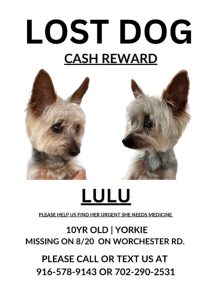 Lulu is a 10 year old yorkie. 4 - 6 pounds. Fresh haircut. Sweet demeanor.