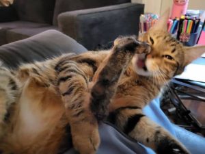 Striped tabby with brown, black, reddish, and white colors. Green eyes. Bottom of paws are black