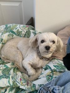 Floppy ears, a wart on back, slightly bowed legs. Intelligent and friendly. Energetic for her age.