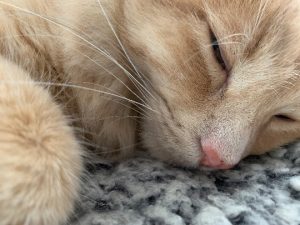He has a very high pitched meow and wants to be let out! He has freckles on his nose and toes.
